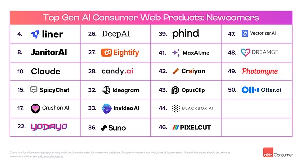 然而,与 a16z 最初的分析不同——当时 a16z 首先根据网络流量对公司进行排名,然后为这些公司添加了移动应用数据——这一次, a16z 将网络和移动生成式 AI 产品分成了两个独立的列表。