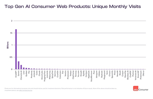 鉴于 ChatGPT 早期的惊人增长——在 a16z 六个月前的分析中,它已经是世界上访问量第 24 大的网站—— a16z 预期这个开创性的聊天机器人将保持其在榜单顶部的地位。