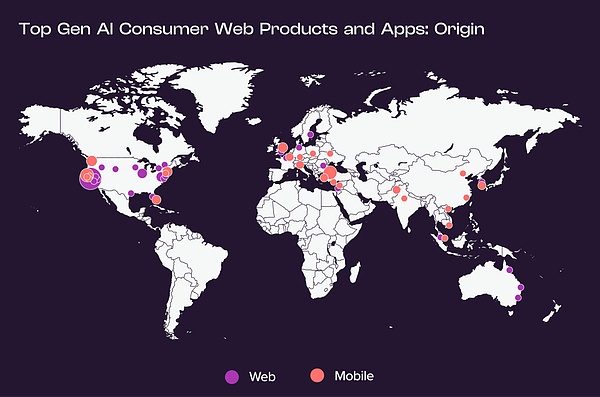 同样,虽然超过一半的顶级生成式 AI 网络产品在美国开发,但不到三分之一的移动应用起源于美国境内。