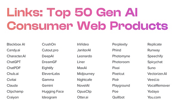 a16z 刚刚发布了 GenAI 消费应用 Top100 报告。自从一年多前 ChatGPT 将生成式 AI 推向公众视野以来, 我们见证了数以千计的新消费产品的诞生,这些产品都融合了 AI 的魔力——从视频生成器到工作流程的小技巧,从创造力工具到虚拟伴侣。