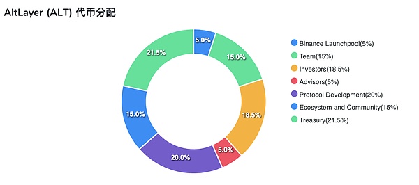 ALT的总供应量为10,000,000,000 ALT;币安 Launchpool发行量为 500,000,000 ALT,占总供应量的 5%;团队分配量为1,500,000,000 ALT,占总供应量的 15%;投资者分配量为1,850,000,000 ALT,占总供应量的 18.5%;顾问分配量为500,000,000 ALT,占总供应量的 5%;协议开发分配量为 2,000,000,000 ALT,占总供应量的 20%;生态系统和社区分配量为1,500,000,000 ALT,占总供应量的 15%;财库分配量为2,150,000,000 ALT,占总供应量的 21.5%。