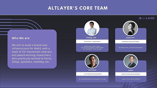 AltLayer由Zilliqa(第一个实现分片的区块链网络)前联合创始人、Parity Asia(区块链基础设施服务公司)前总经理贾耀琪及其团队20余名成员创立。