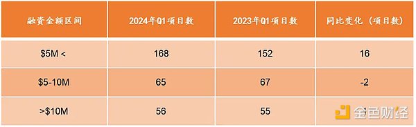 从融资金额区间来看Q1 阶段中后期投融资(>$10M)同比 2023 年 Q1 项目数量保持稳定,早期投资($5M<)同比增长了16个项目,表明资本市场或仍处于估值修正阶段,也说明市场仍有较多未被验证的技术与解决方案。