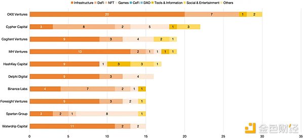 三、Q1出手次数前十的机构总投资数环比增长120%,OKX Ventures出手30次成为Q1最活跃的投资机构