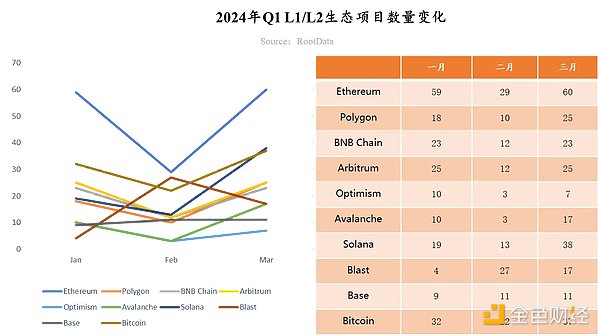 以太坊仍是Web3项目首选生态,Bitcoin、Solana、Blast生态增长迅速。比特币生态由铭文发展到符文,叙事性仍在增强。SOL在第一季度涨幅超过129%,让Solana成为表现最抢眼的公链之一。Blast生态中20个原生项目完成融资,该数据领先于其它Layer2。