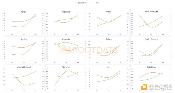 在12个已有TGE的项目中,RootData搜索热度与二级行情呈现相关性,甚至在Pyth Network、Manta Network、Jupiter等项目的二级市场表现上体现了前瞻性。