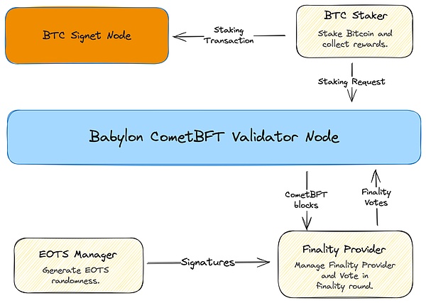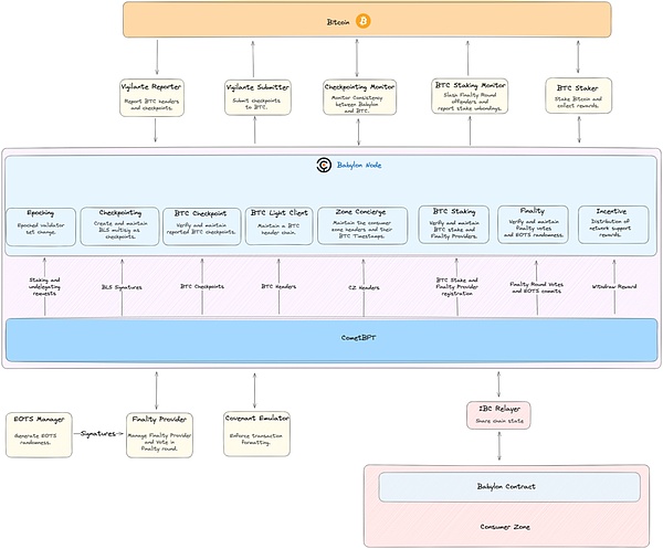 具体来说,Babylon Chain 会双向地与两条链保持沟通,在 PoS 链那端,它们使用 IBC Relayer 来沟通;在比特币主网那端,它们使用 Vigilante Reporter 让讯息从比特币主网传递到 Babylon Chain ,用 Vigilante Submitter 让讯息从 Babylon Chain 传递到比特币主网,用 Checkpointing Monitor 监督双向的讯息正确,用 BTC Staker 纪录质押相关的资讯,用 BTC Staking Monitor 处理罚没相关的问题。