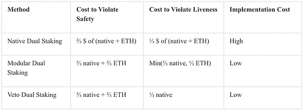 带否决的双重质押:原生代币的运营商自行达到一定的数量标准,同传统的 PoS 无异。ETH 运营商作为额外的一层保障,在原生代币运营商犯错时有权否决。该方案与模块化的双重质押在可用性上有差异:即使基于 ETH 的运营商均断网,该方案下的 PoS 网络也仍然能够正常运转。