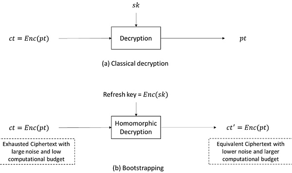 如果噪声是主要问题,并且其增长使FHE变得难以使用,就必须加以控制。这催生了一种称为“Bootstrapping”的新过程。引导是一种使用新密钥对加密数据进行加密并在加密中解密的过程。这非常重要,因为它显著减少了计算开销以及最终输出的解密开销。虽然Bootstrapping 减少了最终的解密开销,但在过程中会有大量的操作开销。这可能既昂贵又耗时。
