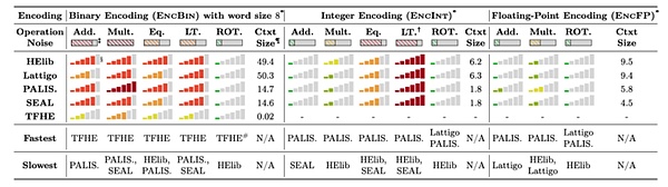 下面是查尔斯·古特、迪米特里斯·穆里斯和奈克塔里奥斯·乔治·楚索斯在其论文《SoK:通过标准化基准对全同态加密库的新见解》SoK: New Insights into Fully Homomorphic Encryption Libraries via Standardized Benchmark(2022)中对不同库的性能比较。