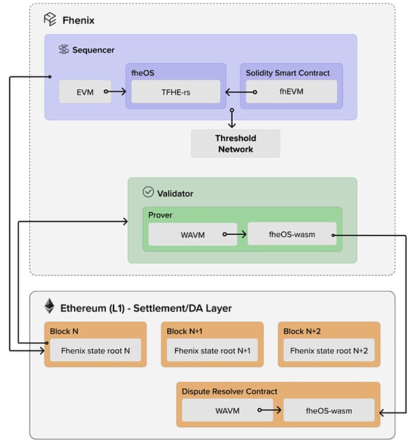 Zama是FHE领域的领先者,以其开发的fhEVM方案而闻名。该方案允许在完全同态环境中执行以太坊EVM计算,确保任何使用该库构建的L1/L2项目在执行层面上的隐私。