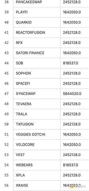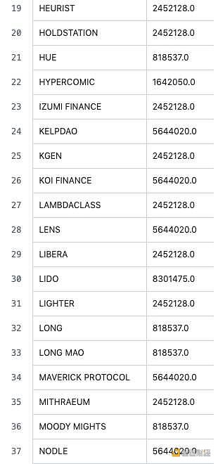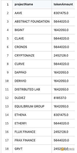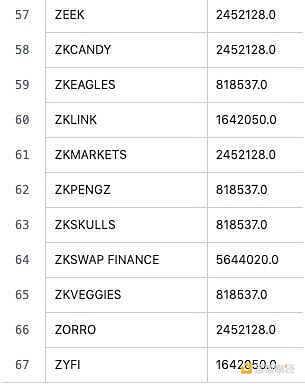 根据 ZKsync公布的结果,总共有67个链上项目获得了空投,数额不等。具体情况如下图: