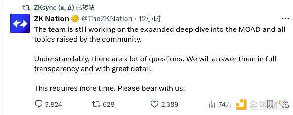 而针对以上这些质疑,zkSync官方回复称,“团队仍在致力于深入研究 MOAD 和社区提出的所有问题。可以理解,大家有很多疑问。我们将以完全透明和详细的方式回答这些问题。这需要更多时间。请耐心等待。”