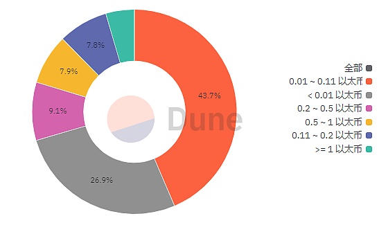 数据也如出一辙,根据Dune数据,用户平均桥接的ETH数量仅为1.37枚,超过80%用户的桥接数量低于1ETH,仅1.3%的地址余额超过10 ETH,可以看出zkSync的主要用户仍是奔着空投而来,而非大资金使用者。
