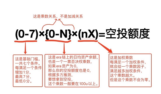 本该是件好事,但空投细则与后续事件却又给了用户当头一棒。从整个额度组成来看,空投有三大部分,一是资格审查,二是基础分配,三是乘数效应。