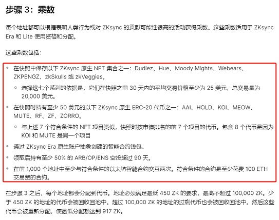 从资格审查来看,空投资格并不严苛,拥有NFT、进行过交互等门槛尽管复杂,但多属于基本操作。但从分配来看,就有了学问。ZKsync创新加入了资金留存这一门槛,不再用常见的月活、交易额、tx数量等跨链常见标准,而更像是质押项目要求。资金留存意味着大资金天然就能获得更多分配,因为从公式来看,空投额度多的账号要么留存时间长,要么资金余额多,两者兼有更佳。而在乘数项,5条乘数更显严苛且难以琢磨,几乎是为老鼠仓量身定制。