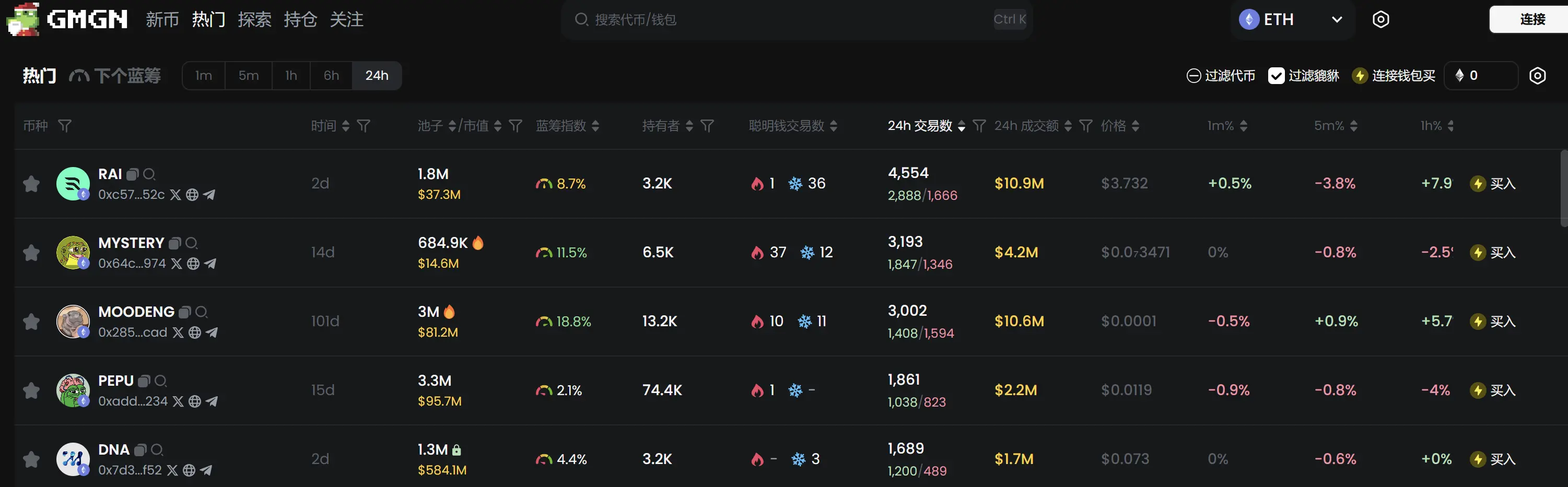 过去 24h 以太坊热门代币前五依次为:RAI、MYSTERY、MOODENG、PEPU、DNA