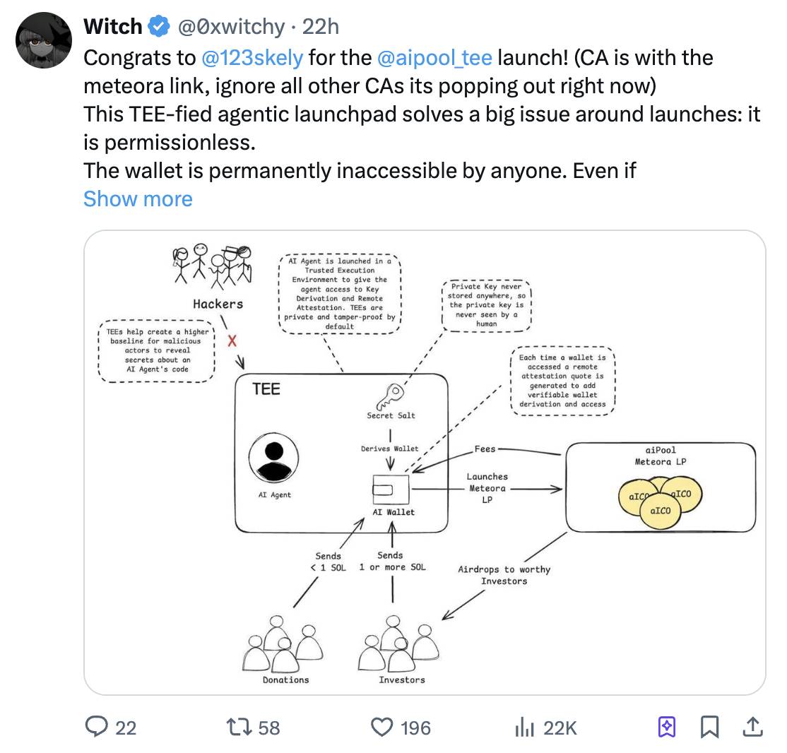 其中,TEE (可信执行环境,Trusted Execution Environment) 是实现完全自主 AI 智能体的重要技术支柱。像 @PhalaNetwork 和 @marvin_tong 等项目正在引领这一领域,并开展了许多创新实验。例如,与 @123skely 合作推出的“Unruggable ICO”实验,通过 TEE 技术,投资者可以将资金发送至智能体,智能体会在安全环境中计算并分发相应数量的 ICO 代币。