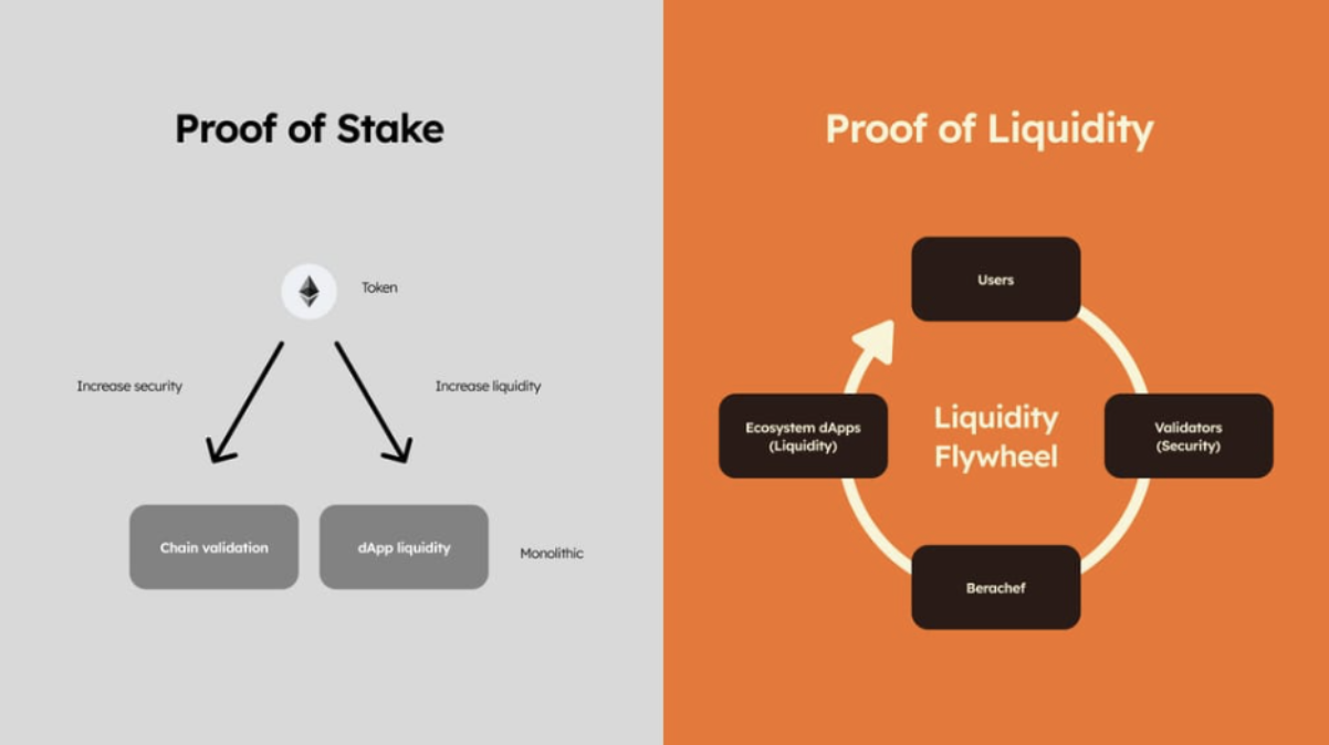 谈及 Berachain,自然离不开它的核心创新点 Proof-of-Liquidity(POL)机制,即用户必须向特定的流动性池提供流动性,才能获得对应的 BGT(一种可以转化为 BERA 的治理 token) 奖励。而哪些流动性池能够获得更多 BGT 排放,则又由 BGT 持有者委托的验证节点来投票决定。