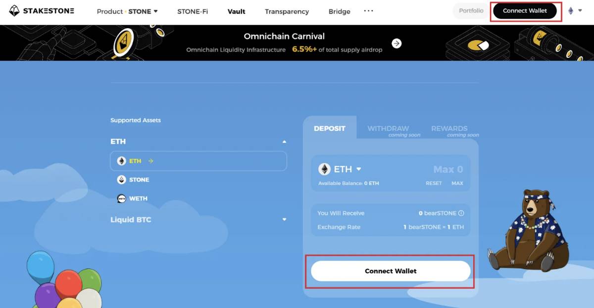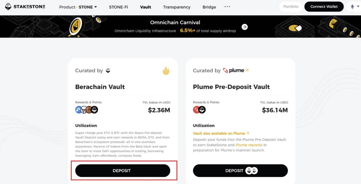 1.进入 StakeStone Vault 界面,点击「Deposit」进入 StakeStone Berachain Vault 界面。