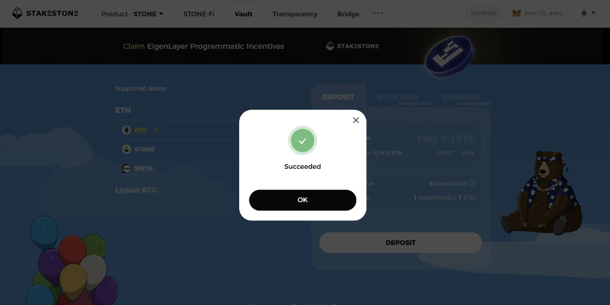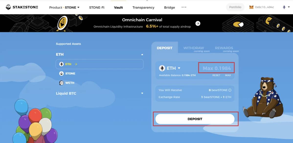 4. 存入 ETH/STONE/WETH,可获得 beraSTONE;存入 SBTC/WBTC/cbBTC/BTCB,可获得 beraSBTC(暂未开启),持有 beraSTONE 或 beraSBTC 可以获得积分。