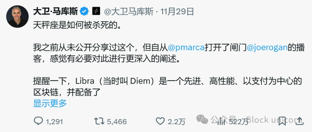 11 月 29 日——前 PayPal 总裁兼 Lightspark 联合创始人 David Marcus (@davidmarcus) 分享了一篇帖子,讲述了政治压力如何扼杀了 Meta 的稳定币项目 Libra。