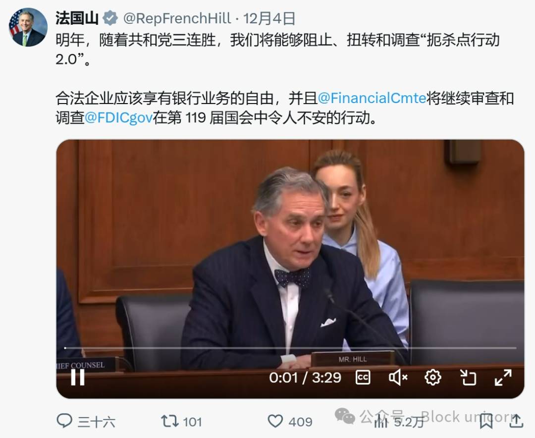 12 月 4 日——美国国会议员 French Hill (@RepFrenchHill) 在国会谈到了加密货币行业的去银行化问题,并承诺要「停止、逆转并调查『扼杀行动 2.0』。」