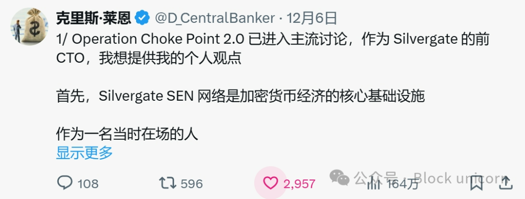 12 月 6 日——Silvergate 前首席技术官 Chris Lane (@D_CentralBanker) 分享了他在加密银行监管压力方面的经历,引起了 David Sacks (@DavidSacks) 的注意,后者分享了 Lane 的帖子并评论道:「有太多关于人们因扼杀行动 2.0 而受到伤害的故事。需要对此进行调查。」