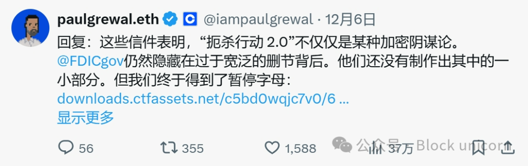 12 月 6 日——在对 FDIC 提起的诉讼中提交的法庭文件披露了该机构要求银行暂停加密相关活动的信件。「这些信件表明扼杀行动 2.0 不仅仅是某种加密阴谋论,」Coinbase 首席法律官 Paul Grewal (@iampaulgrewal) 表示。