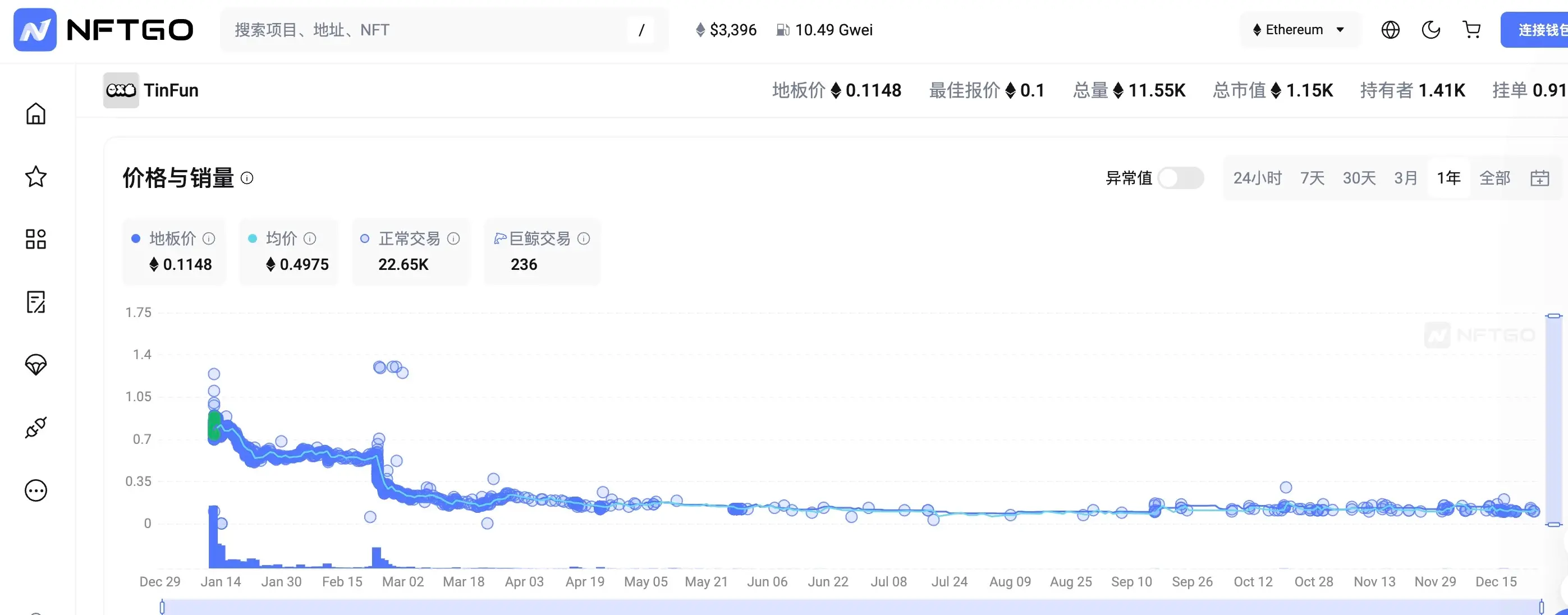 根据 NFTGo 网站数据,Tinfun NFT 目前地板价为 0.11 ETH 左右,但成交均价为 0.5 ETH 左右,持有地址数则逐渐减少至现在的 1400 个左右。
