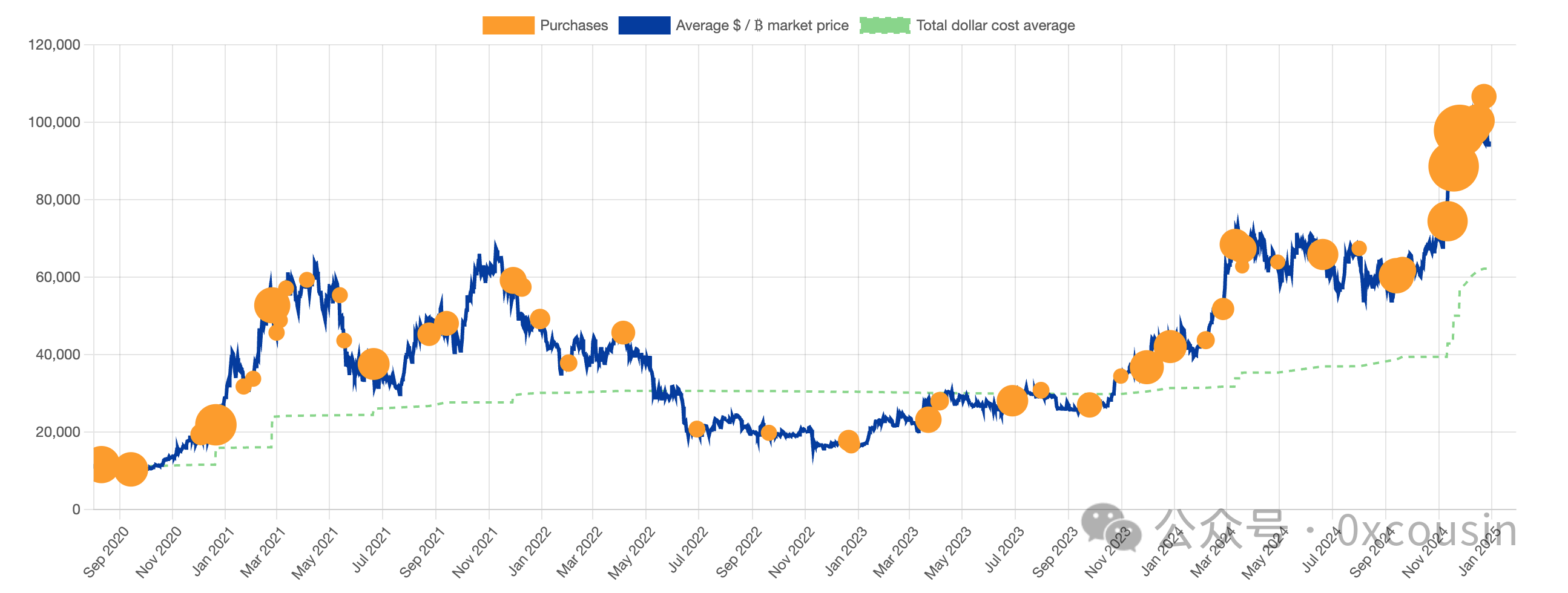 截至 2024 年 12 月 30 日,MicroStrategy总计投资约277亿美元,购买了444262枚比特币,持仓均价62257美元/枚。