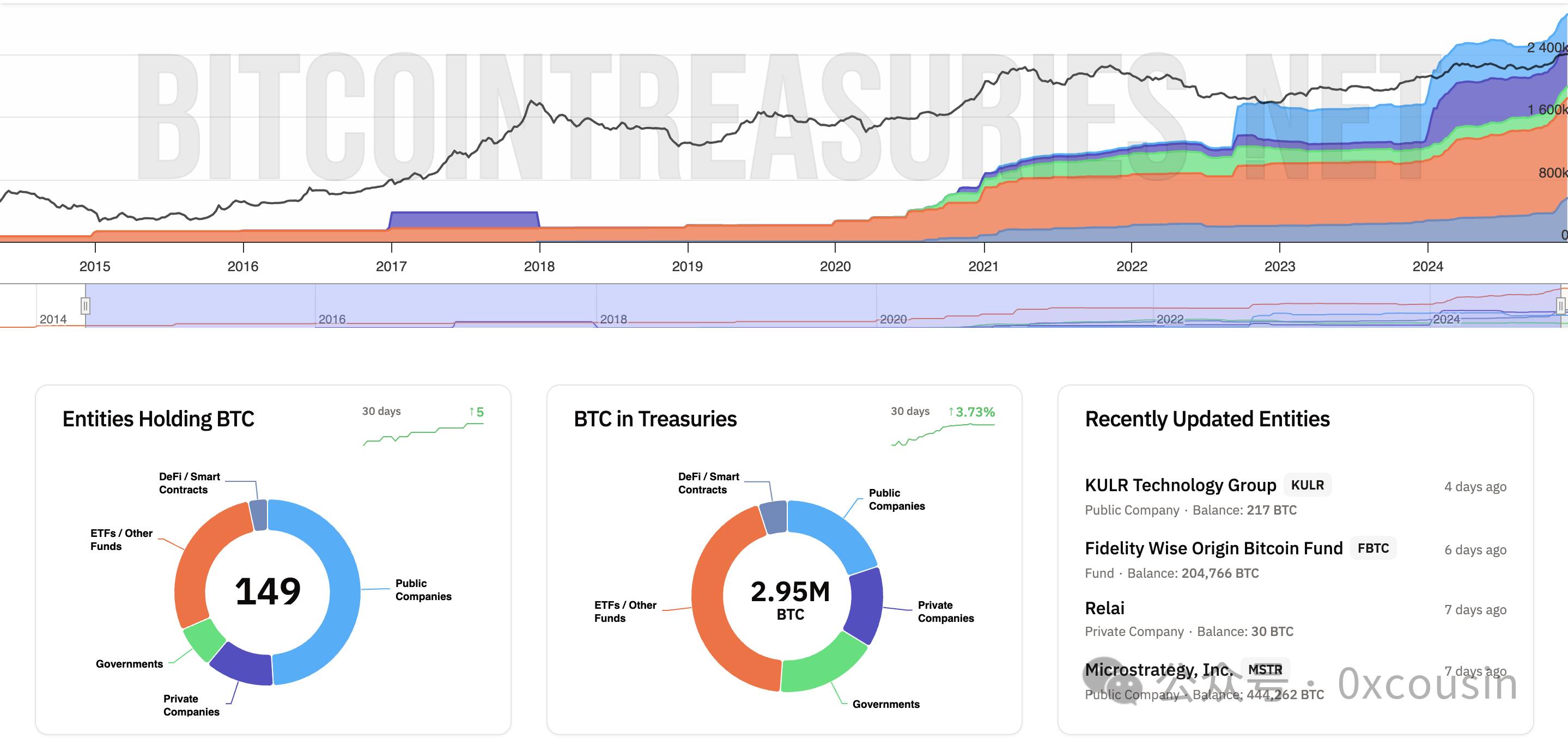 据Bitcointreasuries 数据,截至 2024 年 12 月 30 日,有 149 个主体合计持有超过 295w个 比特币。而且这个数据在近期仍然在快速增长。