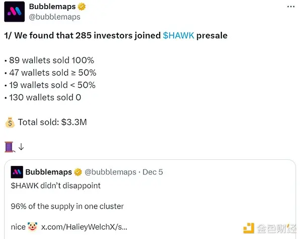 HAWK 于 12 月推出,Bubblemaps 分析称,内部钱包购买了该代币,然后在发布时抛售了大量代币。