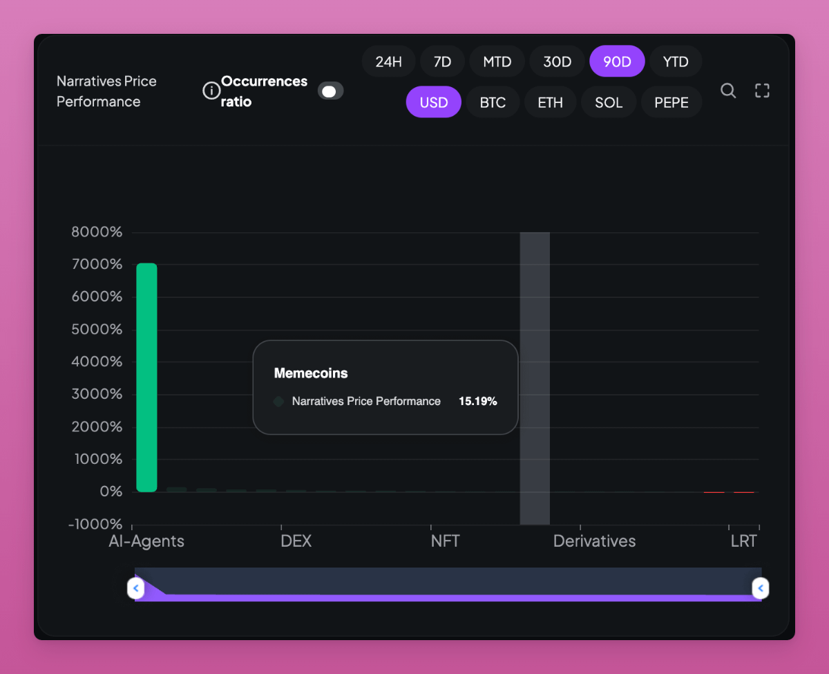 过去 3 个月 AI Agents 叙事的整体市值上涨了 7000%(受新产品的推动),而 Memecoins 仅上涨 15.19%。
