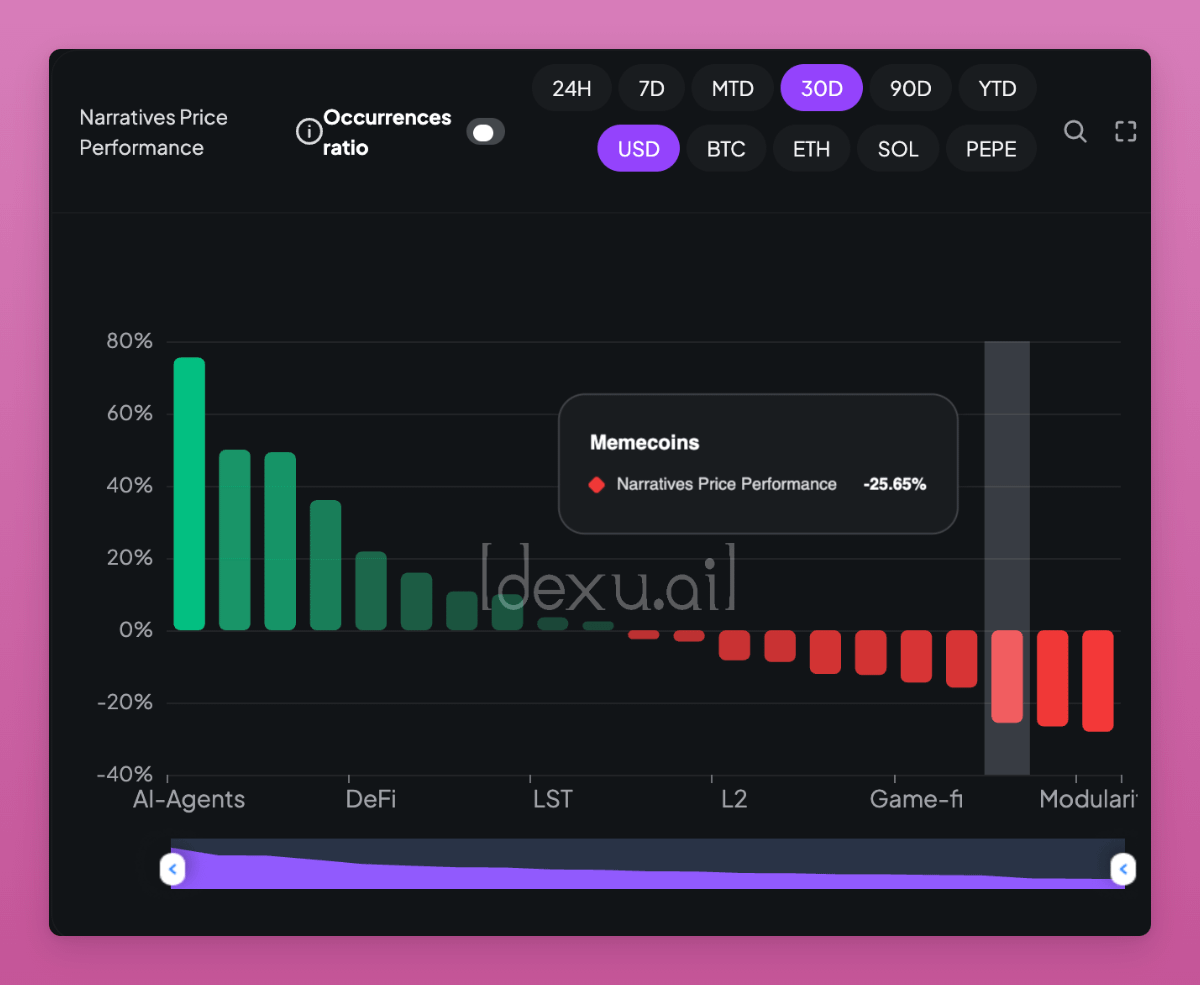 如下图所示,考虑到新推出的 AI 代币波动性,在过去 30D 的表现中,AI Agents 同样出色,上涨了 75%,而 Memecoin 却下跌 25%。