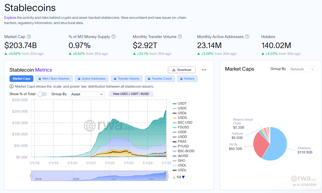 2000 亿美元稳定币市场中,美元稳定币占比超过 95%,其背后的锚定资产主要是美国国债和美元储备。以 USDT 和 USDC 为代表的美元稳定币,通过其在全球支付体系中的应用,不仅巩固了美元的全球地位,还将更多国际资本锁定在美国的金融体系中。这是数字经济时代美元霸权的新形式。