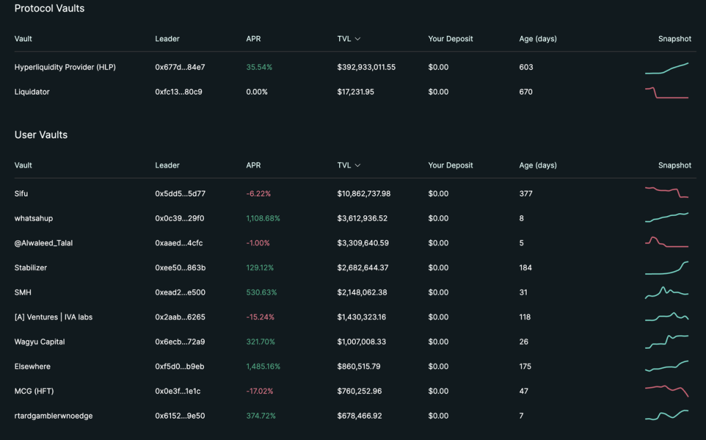 在交易产品之外,Hyperliquid 从产品建立初始就提供了 Vault 的功能,Vault 类似中心化交易所里的「跟单」,所有人都可以将资金投入到任意 Vault 中,由 Vault 主理人进行投资,获得收益中会有 10% 分配给 Vault 主理人,同时为了保持利益一致性,主理人需要保证至少持有 Vault 5% 的份额。
