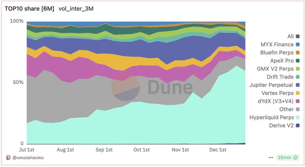 去中心化衍生品交易所交易量占比 来源:Dune