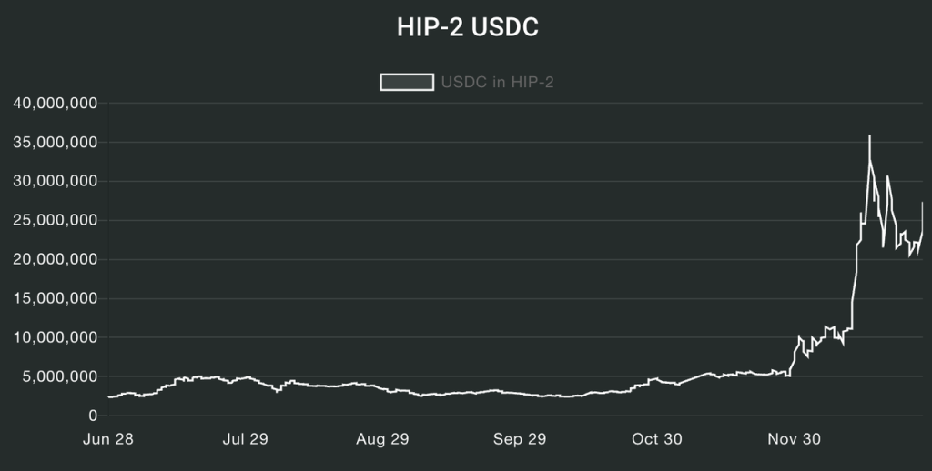 HIP-2 推出之后,诸多新创建的 Hyperliquid 生态代币都选择使用这套 Hyperliquid 的 AMM 机制。目前 HIP-2 总 USDC 量已经超过 2500 万美元。