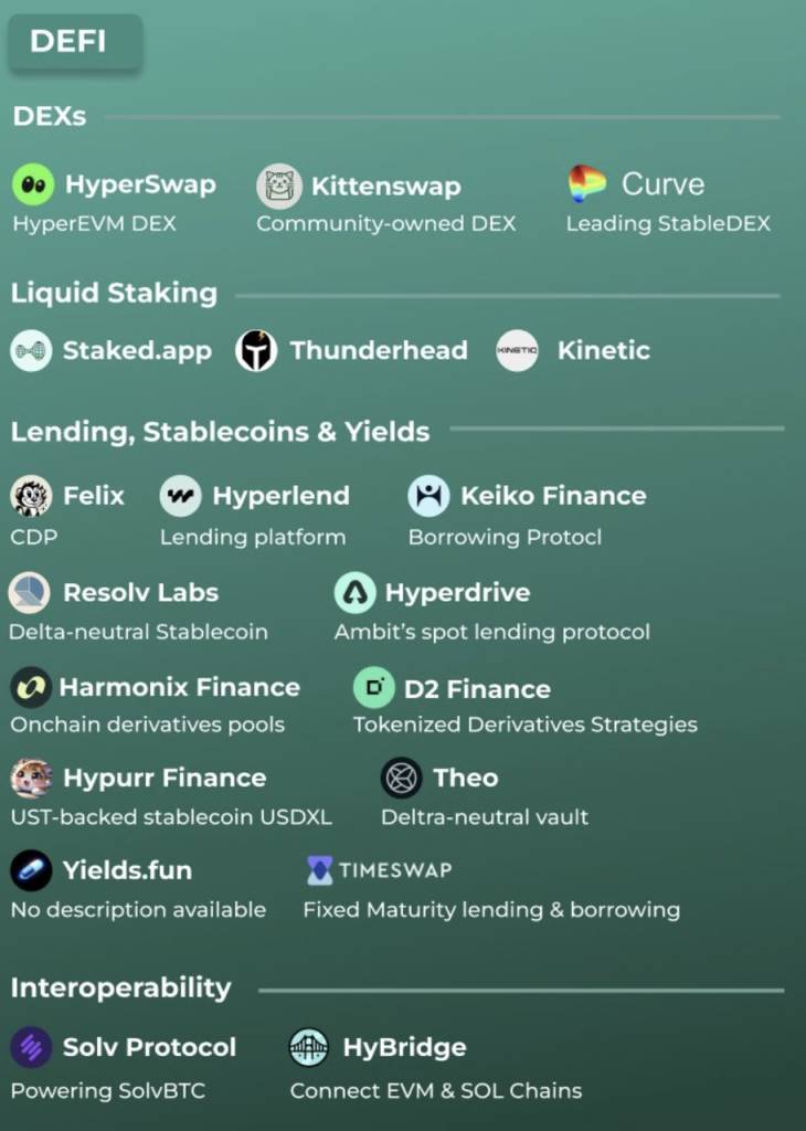 而 HyperEVM 向全部开发者开放,计划在 HyperEVM 上发布的项目众多,除了我们上文提到的部分成功获得 HIP-1 代币的项目之外,下图和 Hypurr.co 网站都列出了相当的部分。