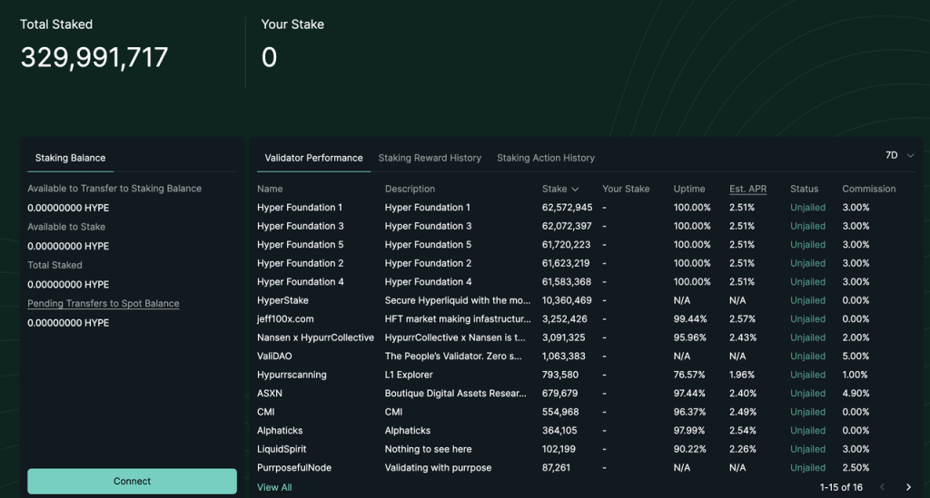 2024 年 12 月 30 日,Hyperliquid 正式上线了 HYPE 质押功能,目前的 HYPE 质押的收益率大概在 2.5% 左右,这部分收益仅包括固定的 PoS 共识层收益,其收益率共识参考了以太坊共识层的收益率共识(收益率与质押 HYPE 数量的平方成反比),目前除了团队和基金会的 3 亿枚代币之外,也有接近 3000 万的用户代币参与了质押。