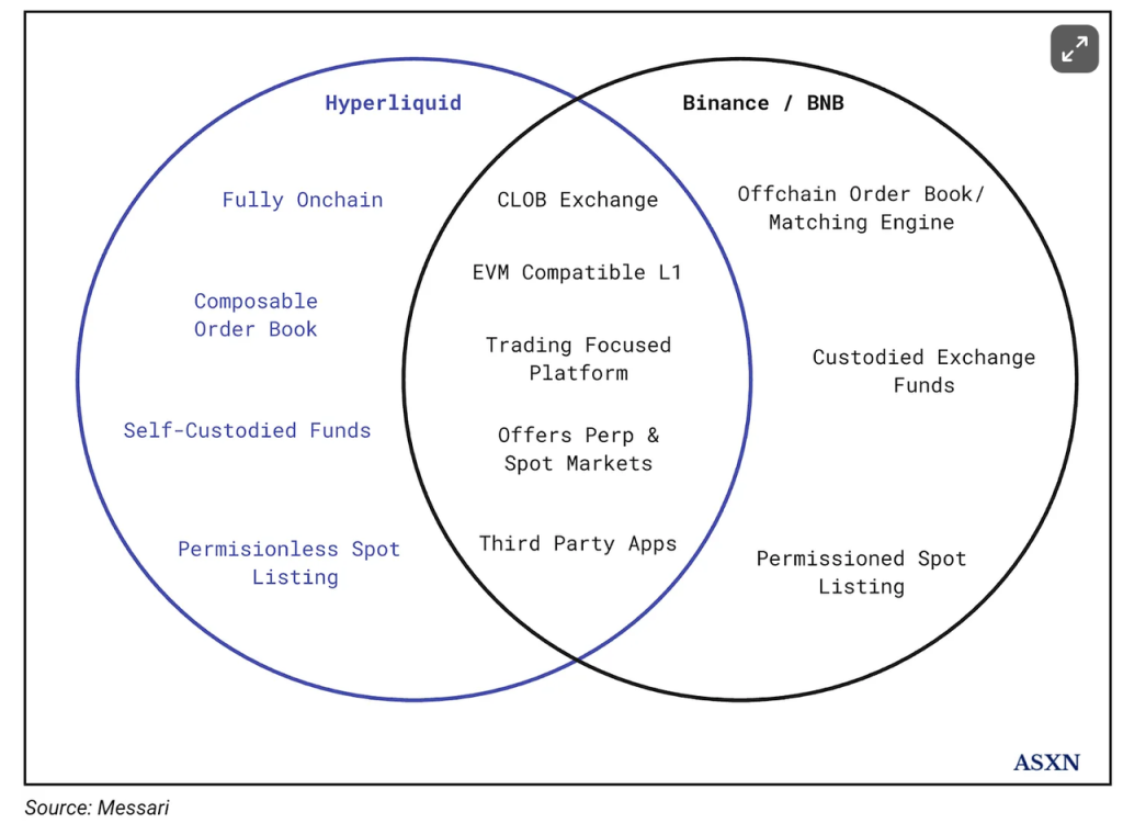 Hyperliquid 的核心业务是衍生品和现货交易所,这与 Binance 所对应的主营业务一致;