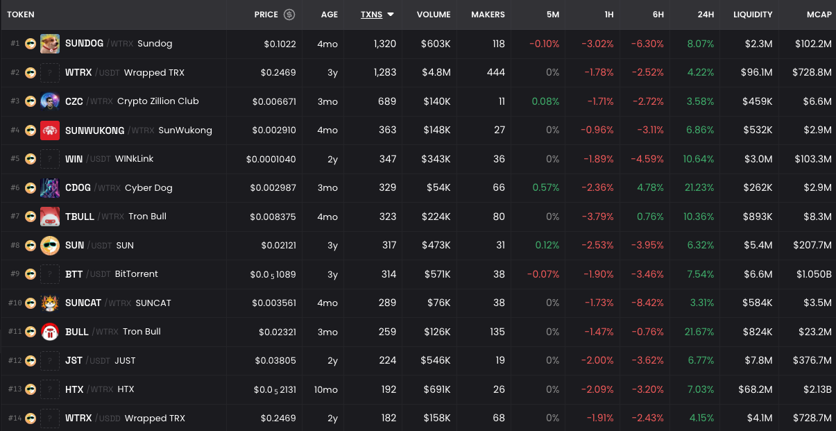 再进一步感受 $SUNDOG 的火爆?我们可以通过 Dexscreener 的交易数据,发现另一个令人印象深刻的数据:无论是 1 小时、6 小时还是 24 小时的交易数据,$SUNDOG 的交易笔数始终稳稳占据榜首位置。其他 MEME 项目在这些数据维度上显得黯然失色。