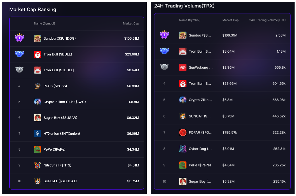 这波热潮并没有因为时间的推移而褪色。截至撰稿时间,目前打开 SunPump 平台的排行榜,$SUNDOG 依然高居榜首。不论是 24 小时交易量,还是 MEME 币的市值排行,$SUNDOG 都展示了压倒性的优势。