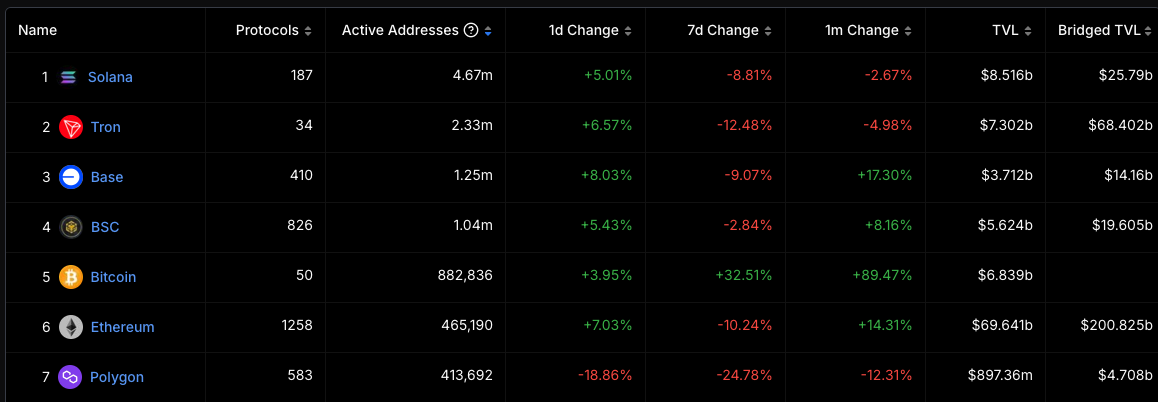 回到更大的图景中,波场本身依然是当前加密行业的重要玩家。在这一轮牛市中,Tron 比以太坊(ETH)更早创下历史新高,活跃地址数仅次于 Solana,TVL(总锁仓量)稳居第三位。而此时的 Solana 因 MEME 币的激烈竞争开始显得有些「内卷」,以太坊则受制于高昂的 gas 费用和相对缓慢的交易速度。在这样的背景下,波场逐渐成为 MEME 币爱好者们一个值得关注的新战场。