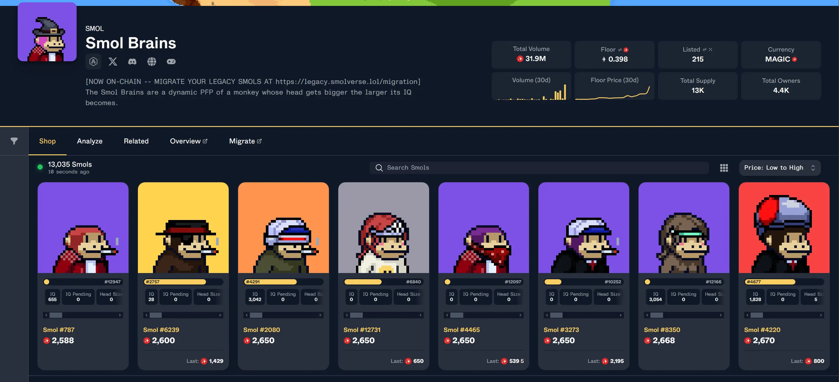 Smol Brains 的代币 $SMOL 在过去一周也最高上涨了 8 倍,$SMOL 会迁移到 V2 版本以加强在 Smol World 游戏中的效用。目前,$SMOL 的市值大约为 1650 万美元。