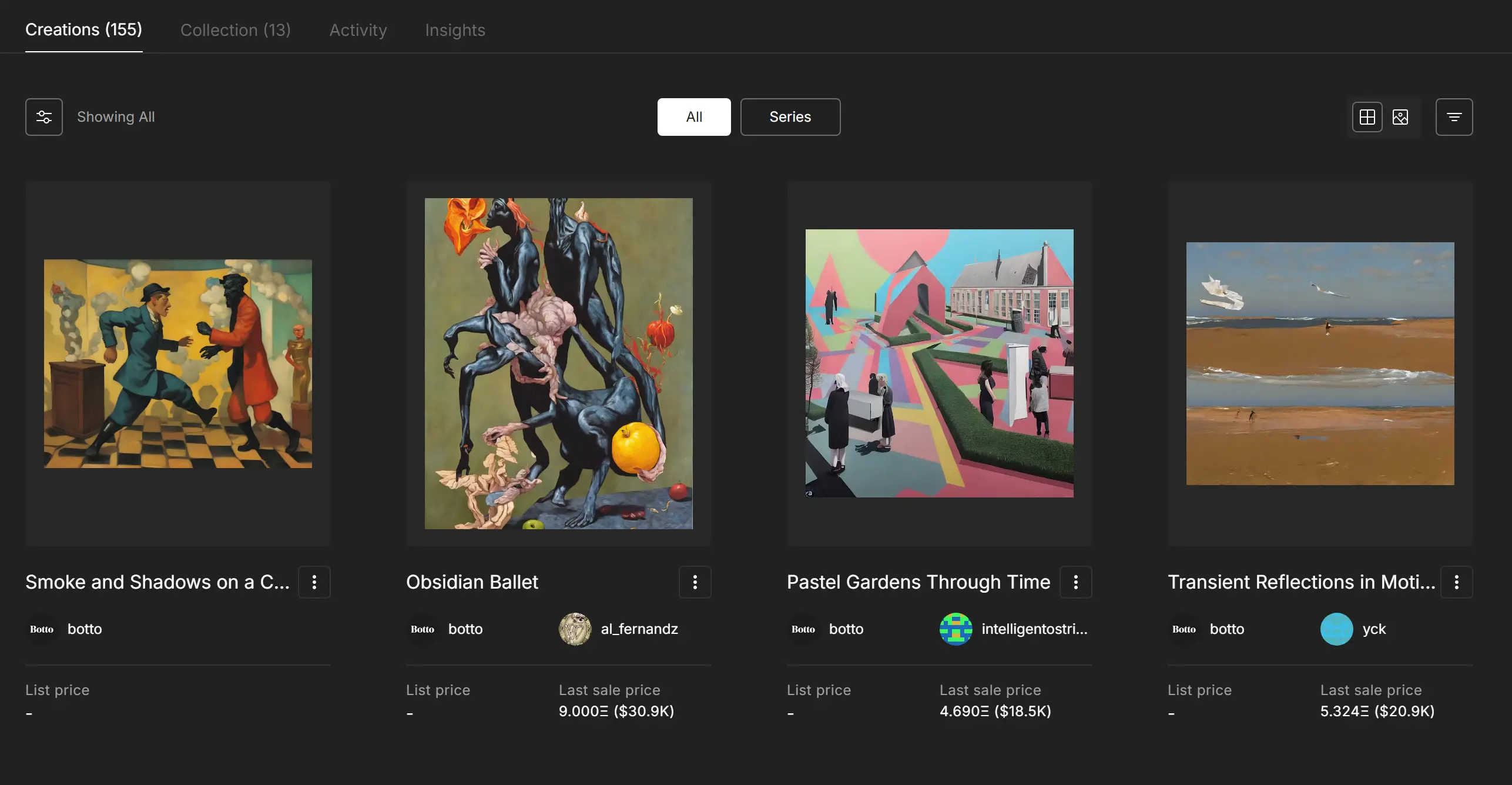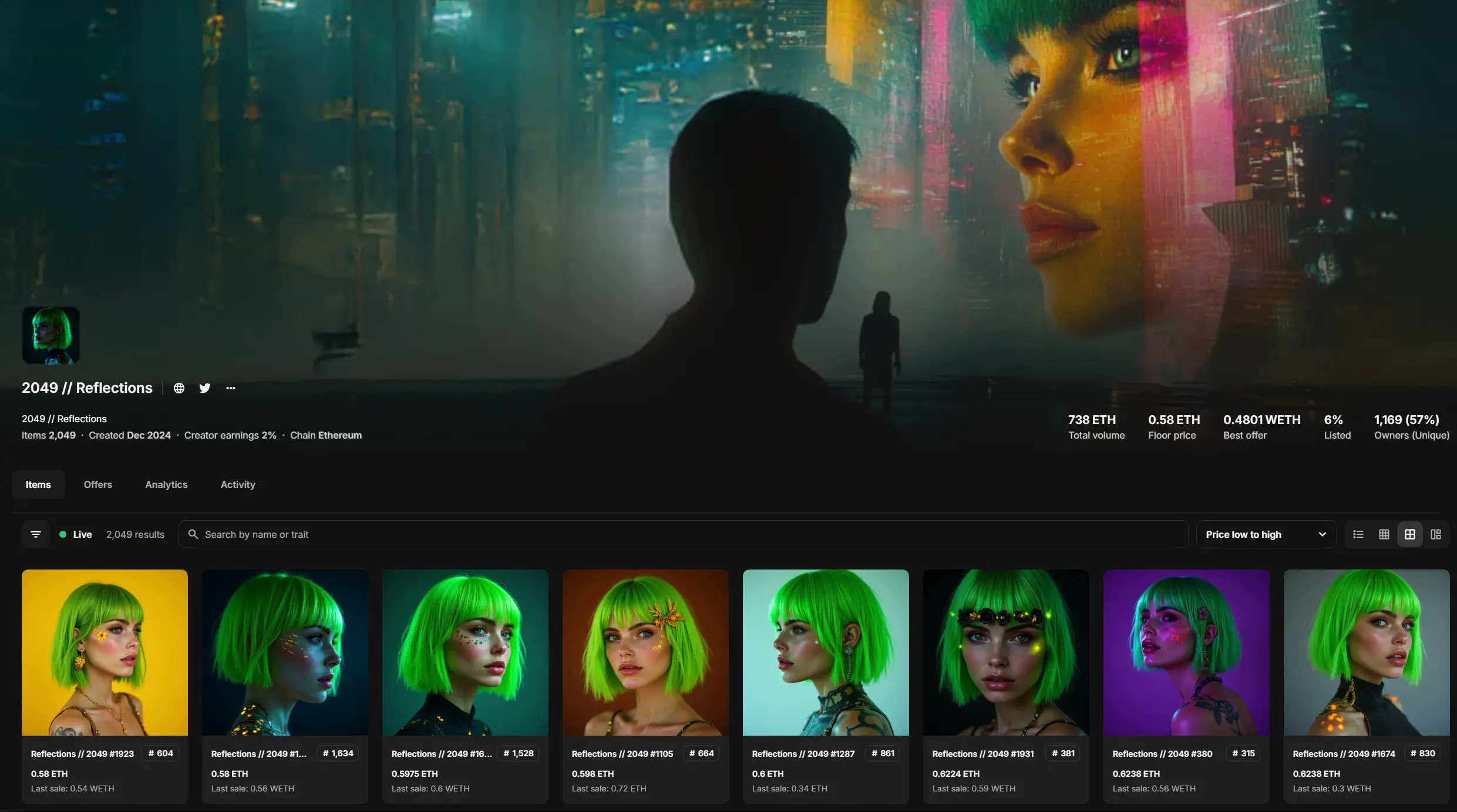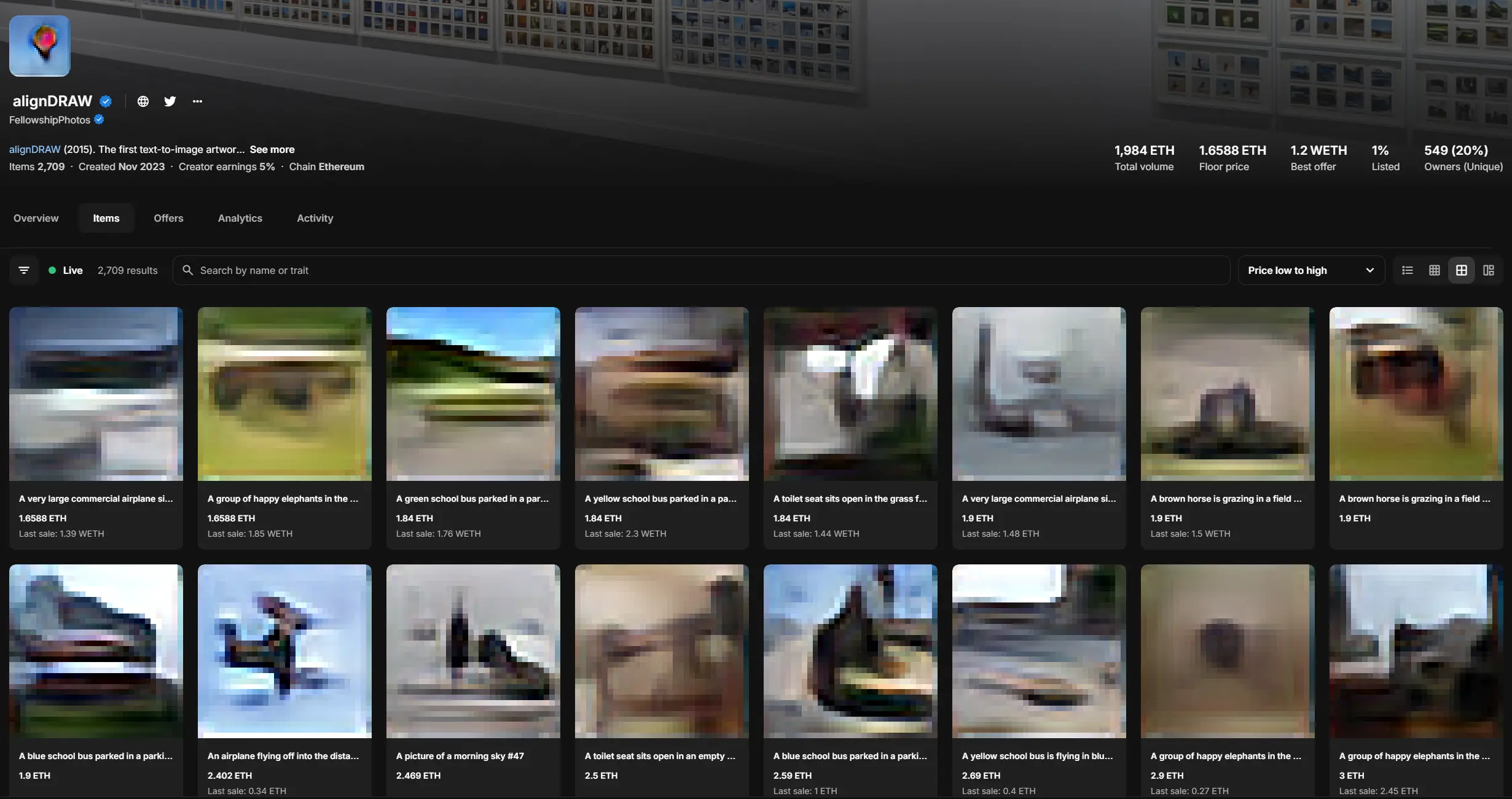 这是一个纯艺术项目,主打的就是一个 AI 发展历史叙事。2024 年,该系列曾达到历史最高价接近 3 ETH,最开始的铸造价格则是 0.1 ETH。目前,该系列地板价约为 1.66 ETH。