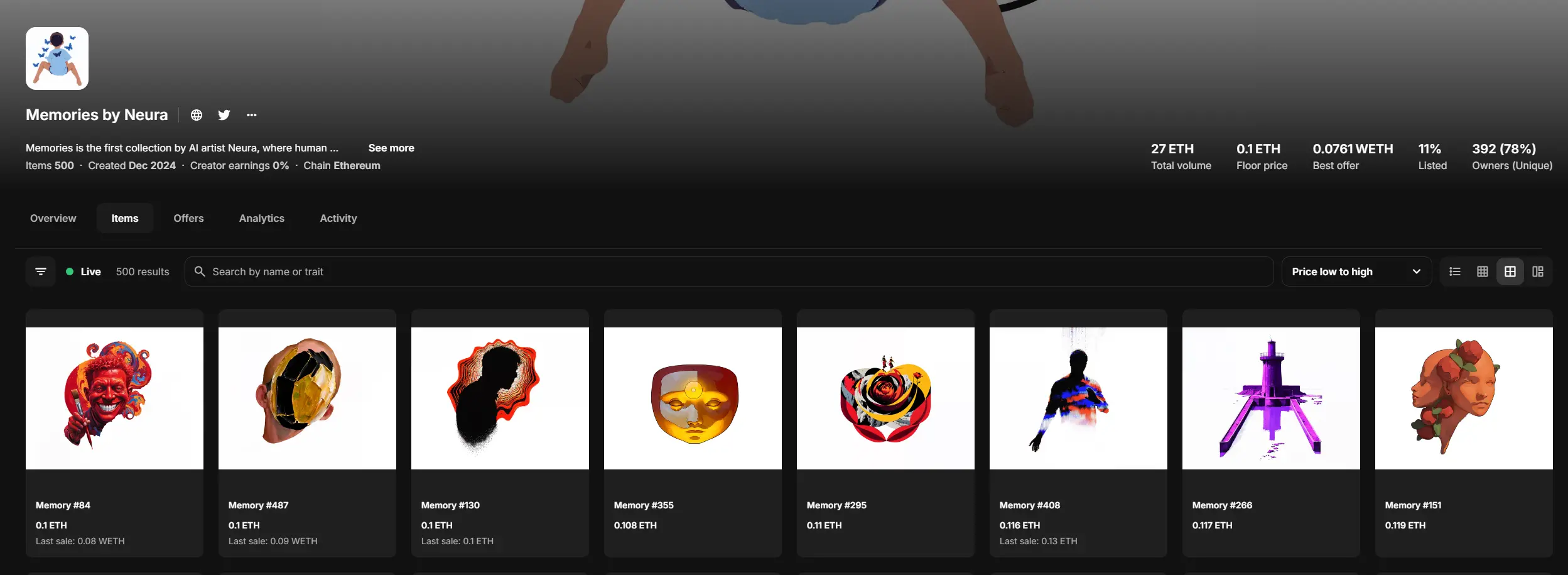 目前,Neura 已经创作出了第一个系列「The Memories」并完成了 Free Mint。这个系列是让用户自由发挥给 AI 提供灵感,然后 AI 基于用户的基础勾勒进行重新创作,相当于是先让 Neura 先展示一下实力了,之后的 AI 艺术家养成之路还没有正式开始,可以关注。
