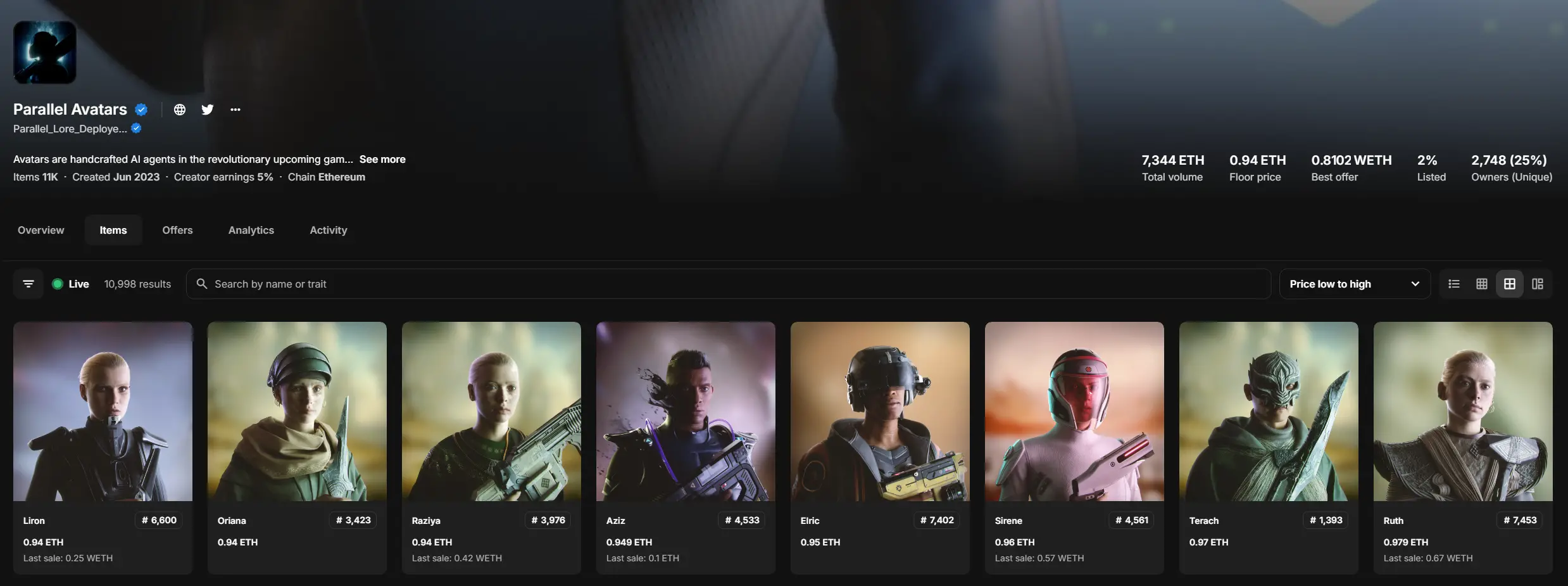 初始的 AI Agent 游戏角色是需要通过 Parallel Avatars 来创造的,后续也会有机制让普通玩家也可以获得 AI Agent 游戏角色来参与游戏。目前,Parallel Avatars 的地板价接近 1 ETH。