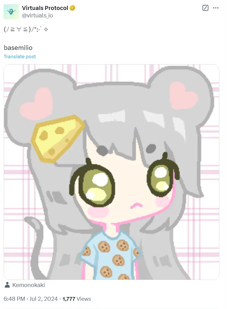另外,在 2024 年 7 月的时候,Virtuals 官推也发过 Kemonokaki。当然这个时间过去比较久了,不太能说明什么问题,更多是说明 Kemonokaki 的 Base Milady 地位。